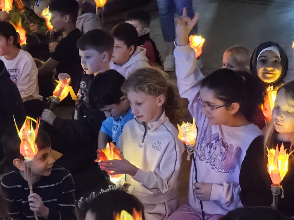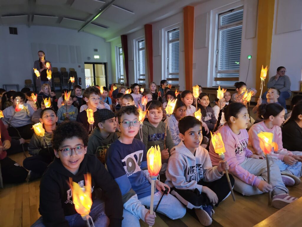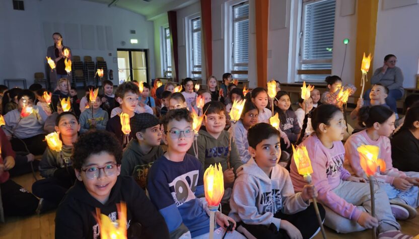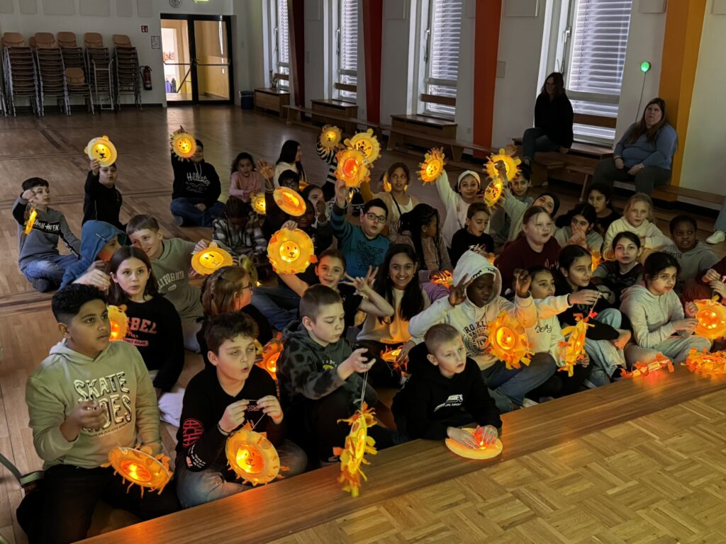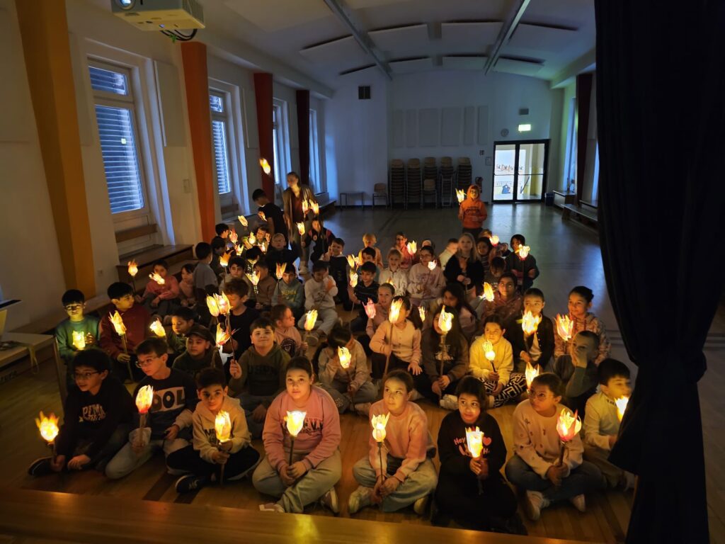 Am Sankt-Martins-Tag haben wir in der Aula gemeinsam eine schöne Feier erlebt. Die Kinder zeigten stolz ihre selbstgebastelten Laternen und ließen sie im Schein der Lichter leuchten. Anschließend hörten alle die Geschichte von Sankt Martin und lernten, warum das Teilen so wichtig ist.